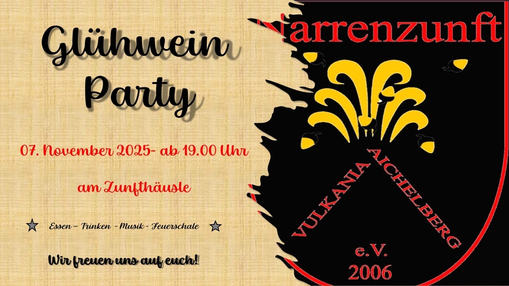 die Narrenzunft Vulkania Aichelberg e.V. lädt am 7. November 2025 ab 19:00 Uhr zur Glühwein – Party auf dem Aichelberg Rathausplatz ein. Bei chilliger Musik und Feuerchen könnt ihr die „Seele“ baumeln lassen. Der Eintritt ist frei und das Event findet „nur“ bei gutem Wetter statt.